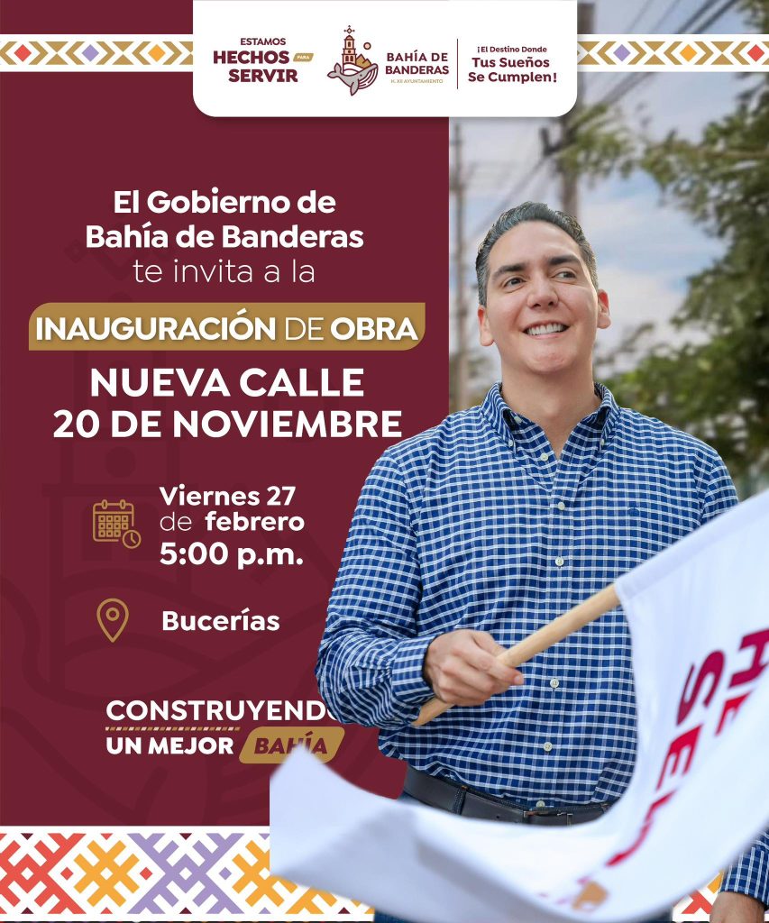 El Gobierno Municipal de Bahía de Banderas, que encabeza el presidente municipal Héctor Santana, invita a la gran inauguración de la nueva Calle 20 de Noviembre, en Bucerías.